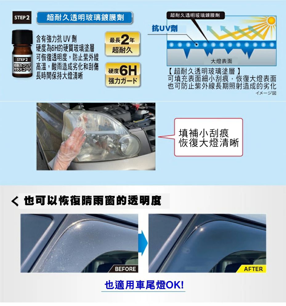 車頭燈清潔劑和塗層劑,無需擦拭即可輕鬆去除泛黃和泛白現象,並保持長時間清晰