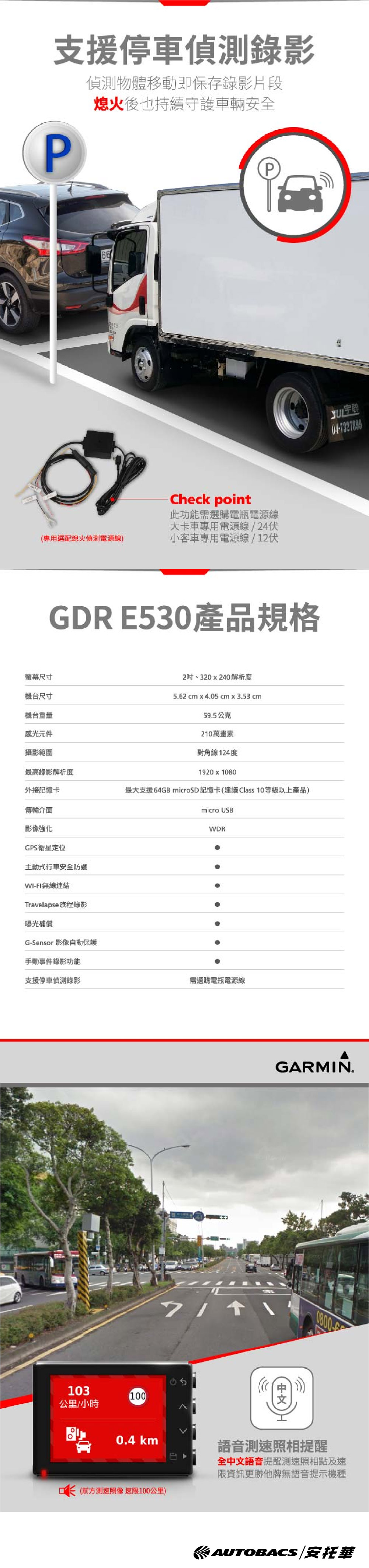 GDR E530具備全新小巧外型與磁吸式固定座,便於拆裝且大幅降低視線遮蔽。124度廣角範圍與高畫質1080p錄影,搭配Garmin獨家低照度、低雜訊影像處理技術,大幅降低暗部雜訊,將前方一切盡收眼底。2吋LCD液晶顯示螢幕,調整角度、播放影像都方便。透過GPS衛星定外及不間斷、不漏秒的循環記錄,影片/照片可內嵌位置、時間、速度等資訊,忠實還原事故發生狀況。