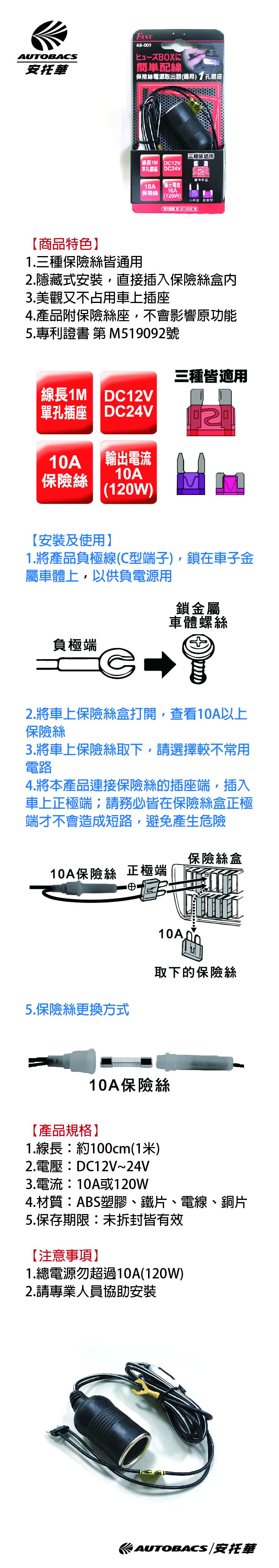 4.將本產品連接保險絲的插座端,插入車上正極端;請務必皆在保險絲盒正極端才不會造成短路,避免產生危險