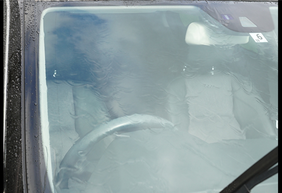 2. 將本品充分搖動均勻後,倒出適量於海綿的灰色面上,直接用力擦拭玻璃表面,直到驅水鍍膜完全消失為止。