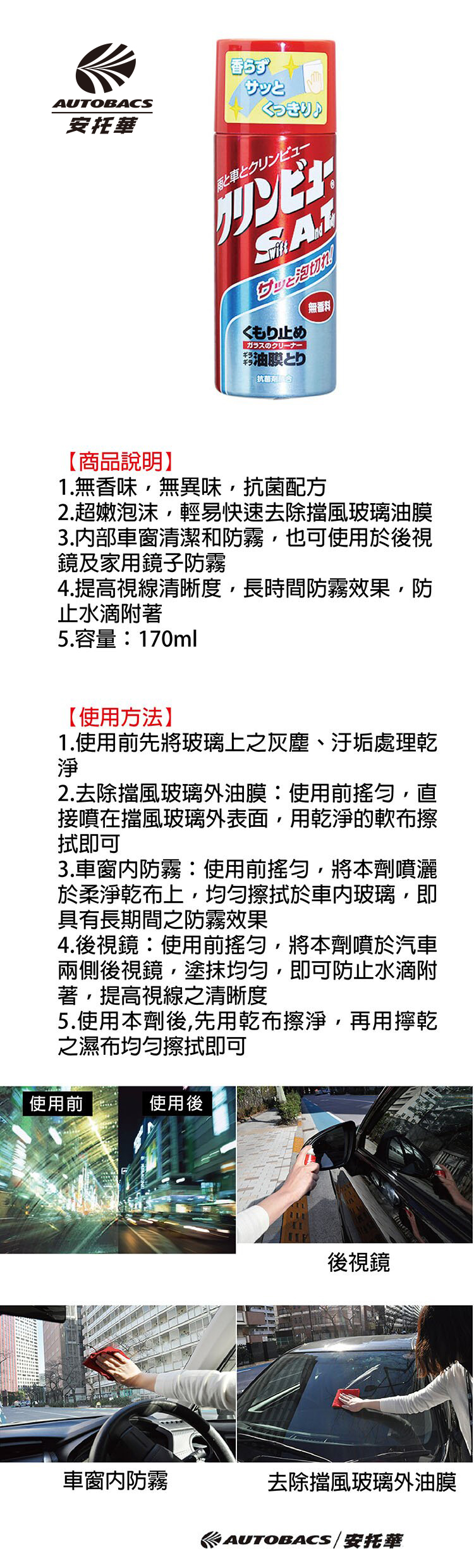 3.車窗內防霧:使用前搖勻,將本劑噴灑於柔淨乾布上,均勻擦拭於車內玻璃,即具有長期間之防霧效果