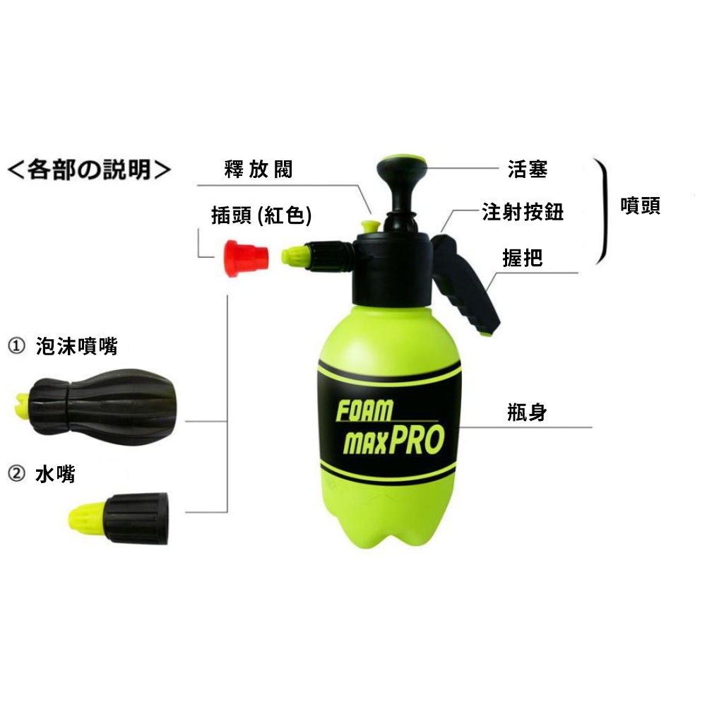 ●內容物:車身灑水器本體×1、起泡式噴嘴×1、水用噴嘴×1、橡膠套件X1, 預備用噴嘴先端旋轉器×1、説明書×1