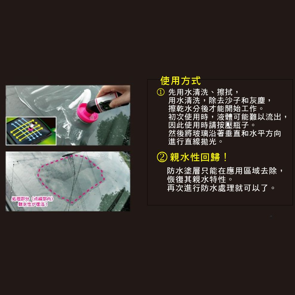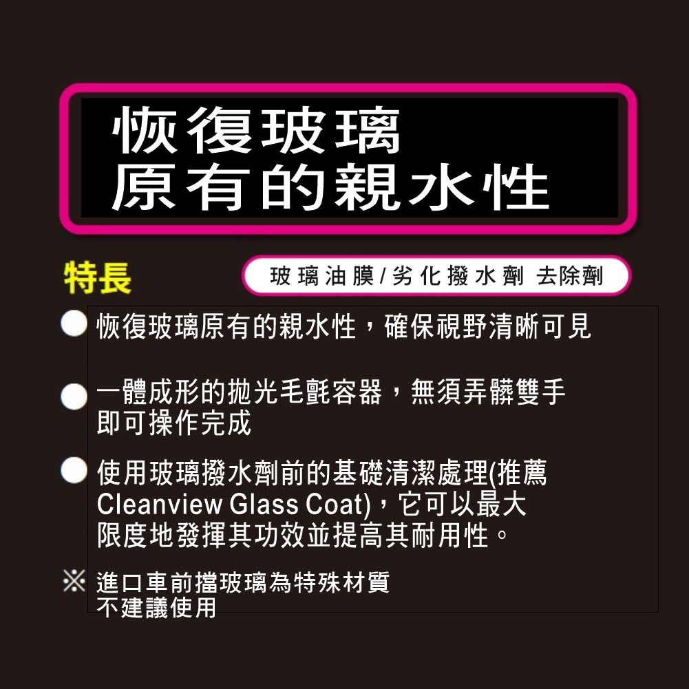 ●恢復玻璃原有的親水性,保持清晰視野。