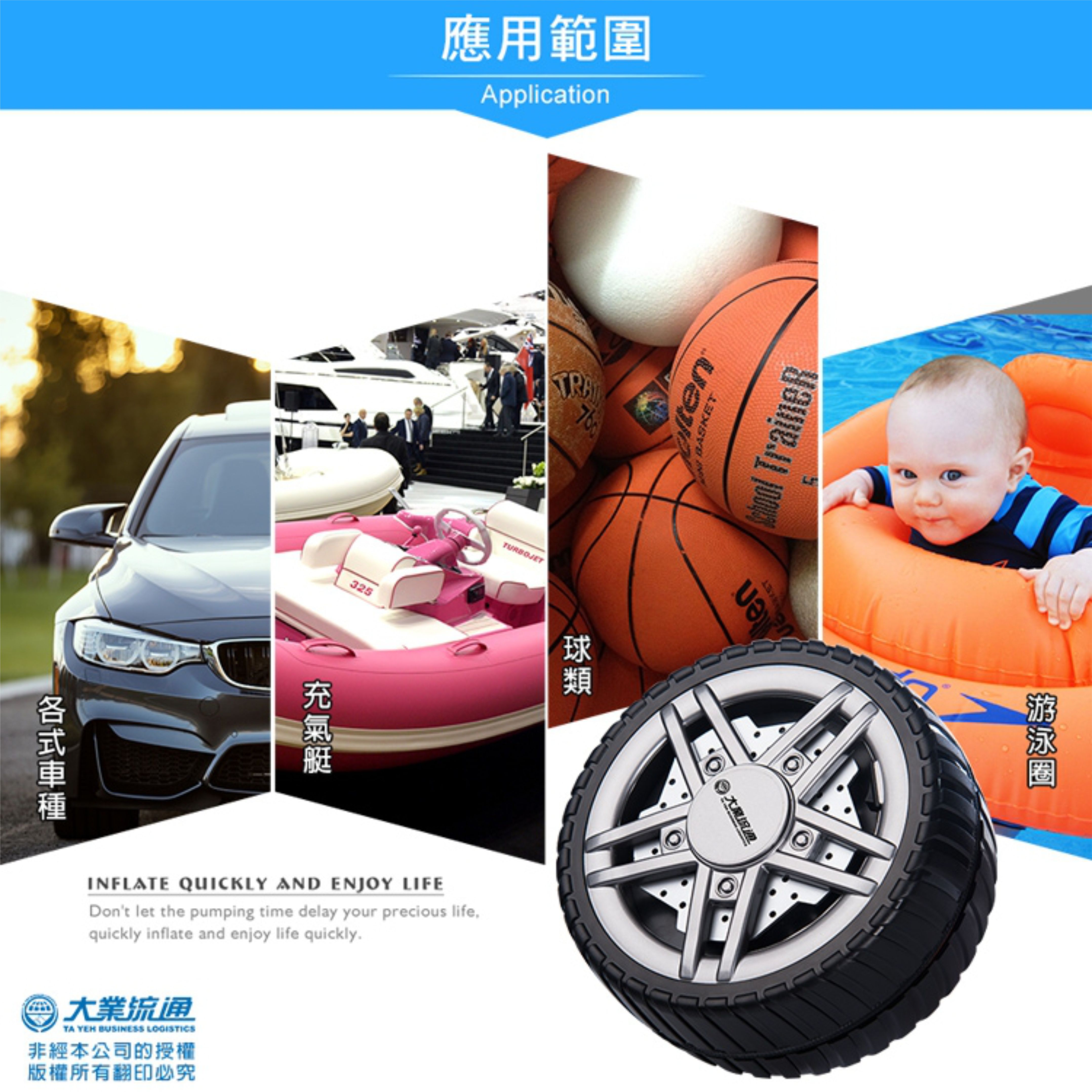 輪胎造型,輕巧時尚,充氣、照明、胎壓三合一,不只實用,更可當車內擺飾。