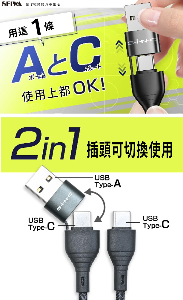【SEIWA 】2用USB.Type-C充電線D611