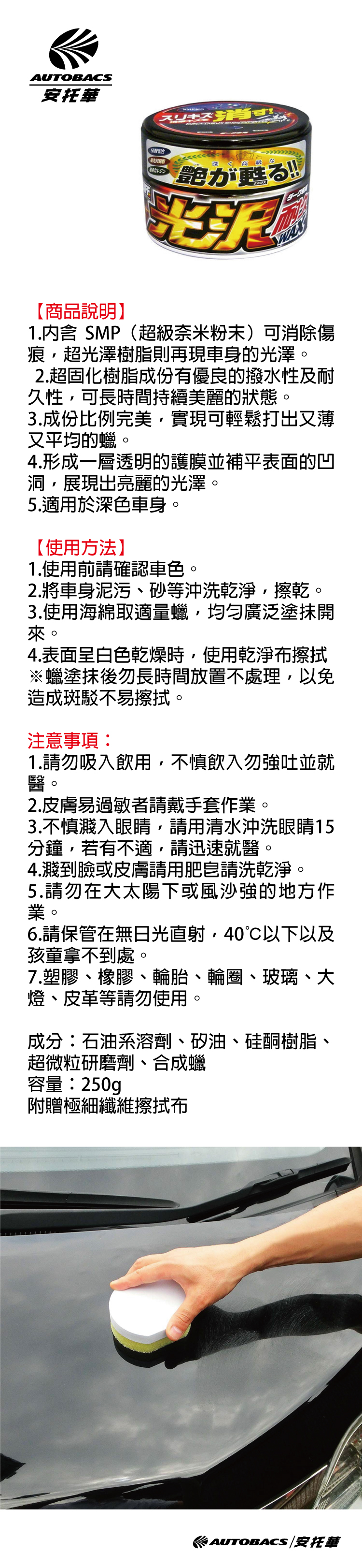 1.內含 SMP(超級奈米粉末)可消除傷痕,超光澤樹脂則再現車身的光澤。