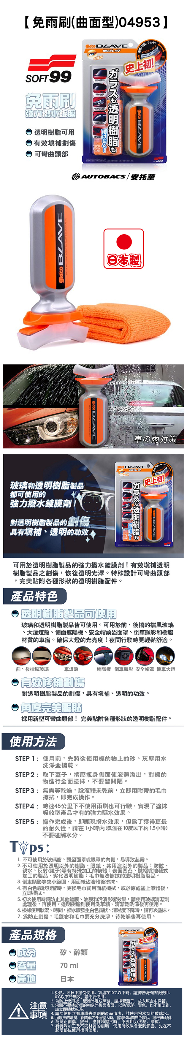 ●可使用於前、後檔的擋風玻璃、大燈燈殼、側面遮陽板、安全帽頭盔面罩、倒車顯影和樹脂材質的車窗