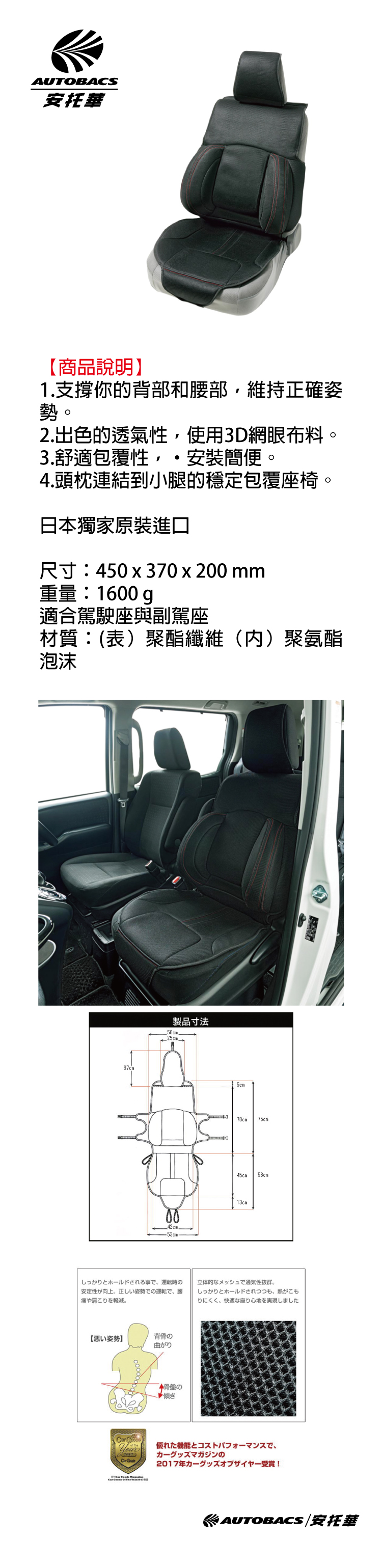 出色的透氣性,使用3D網眼布料,舒適包覆性,·安裝簡便。