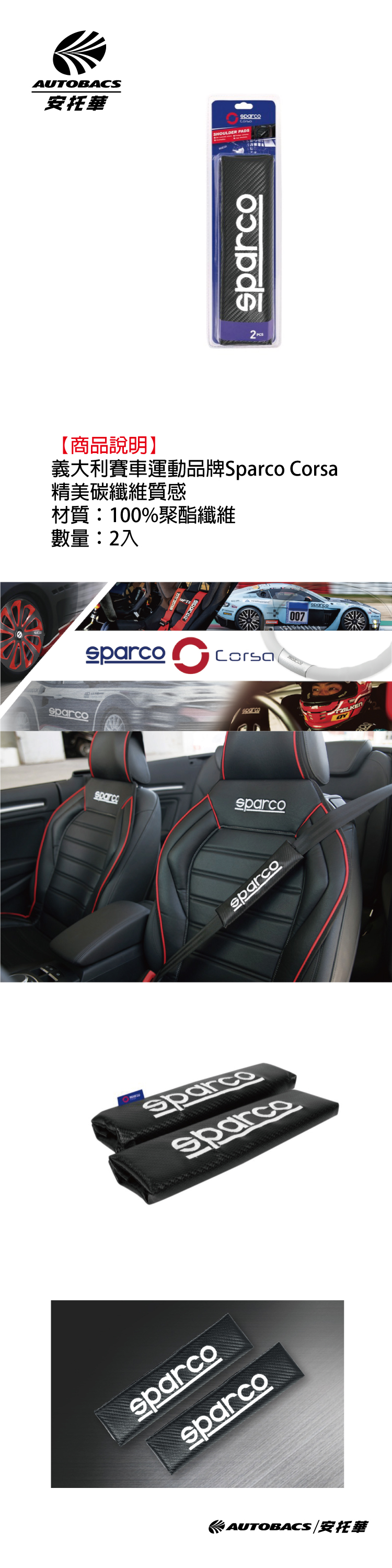 【商品說明】 義大利賽車運動品牌Sparco Corsa 精美碳纖維質感 材質:100%聚酯纖維 數量:2入