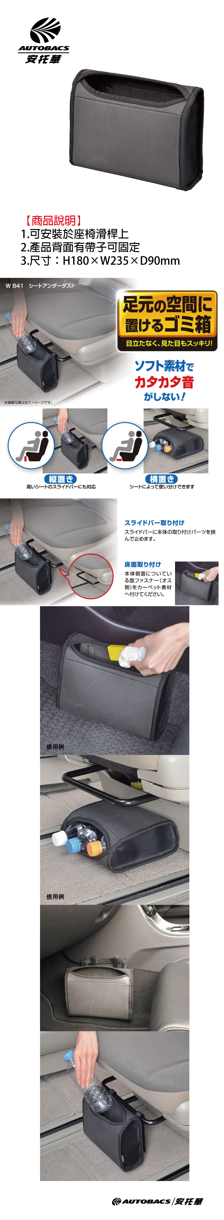 ●可安裝於座椅滑桿上 ●產品背面有帶子可固定 ●尺寸:H180×W235×D90mm