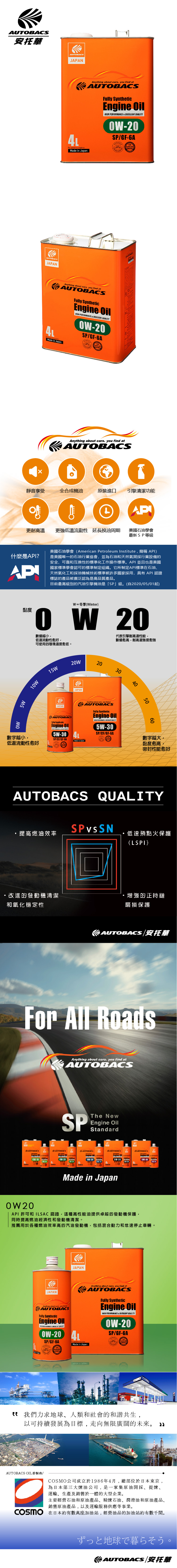 品名:日本 AUTOBACS Engine Oil 0W20 SP/CF 4L 全合成機油/最新API SP認證等級