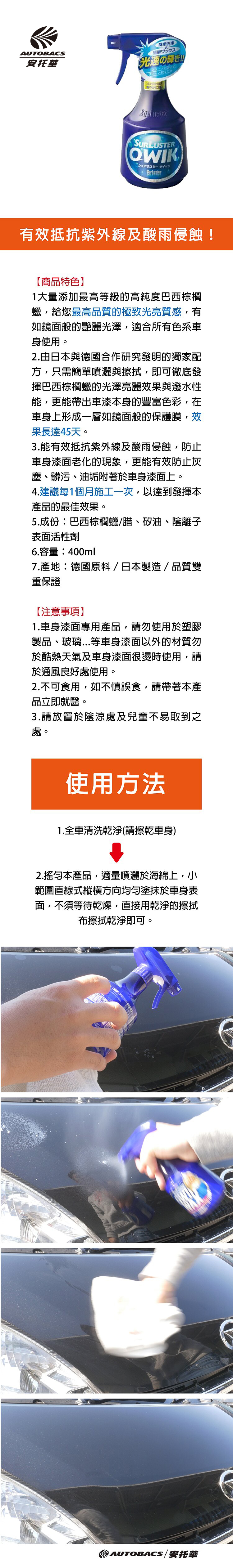 2.由日本與德國合作研究發明的獨家配方,只需簡單噴灑與擦拭,即可徹底發揮巴西棕櫚蠟的光澤亮麗效果與潑水性能,更能帶出車漆本身的豐富色彩,在車身上形成一層如鏡面般的保護膜,效果長達45天。