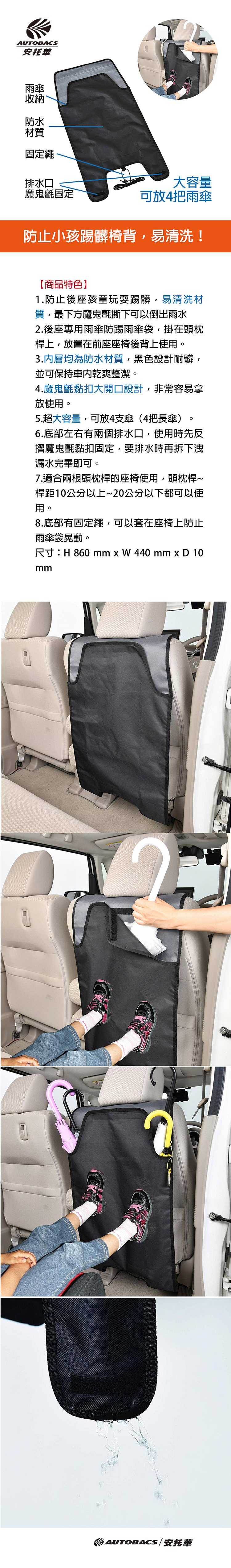 2.後座專用雨傘防踢雨傘袋,掛在頭枕桿上,放置在前座座椅後背上使用。