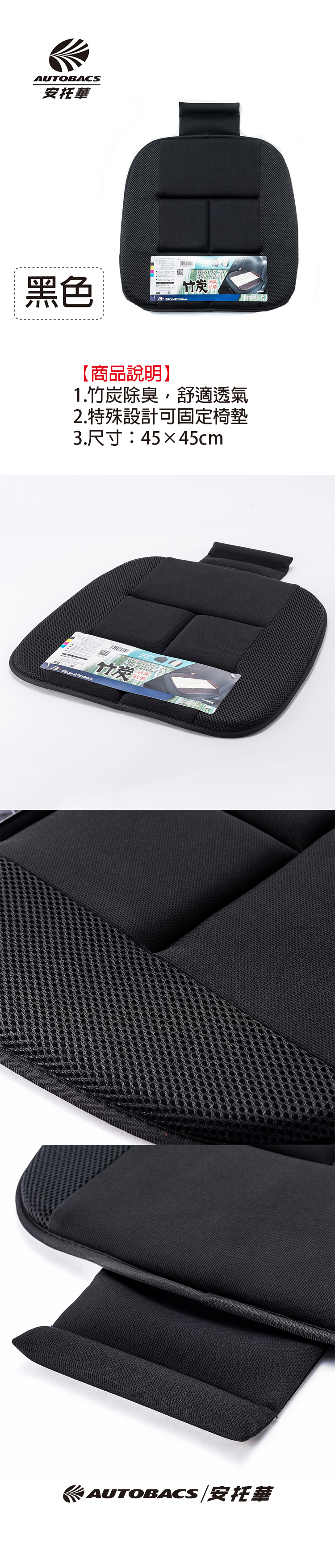 ●竹炭除臭,舒適透氣 ●特殊設計可固定椅墊 ●尺寸:45×45cm