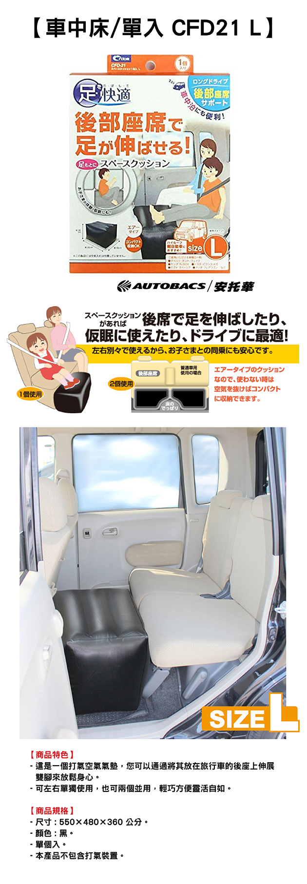 ●充氣氣墊,您可放置在休旅車後座伸展雙腳放鬆。
