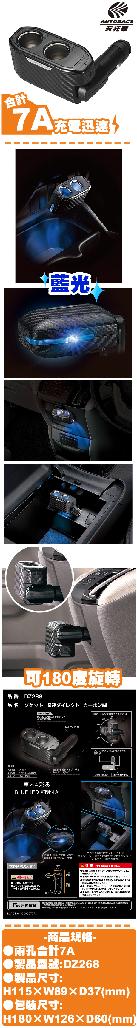 車充-碳纖紋卡夢-雙孔L型插座DZ268/藍光