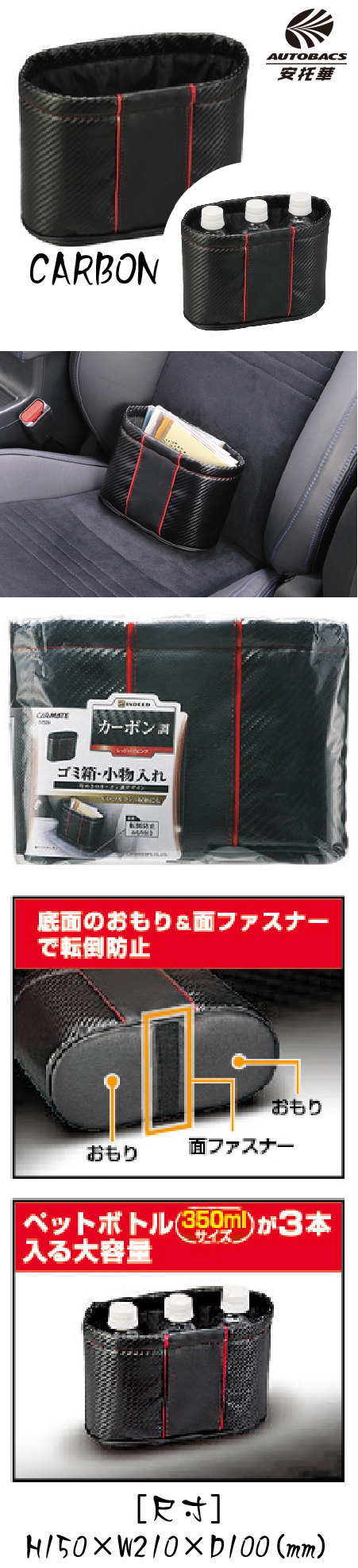 垃圾桶底部有魔鬼氈,可以讓您黏扣在車上的絨毛地毯或絨毛腳踏墊上使用,避免垃圾桶傾倒