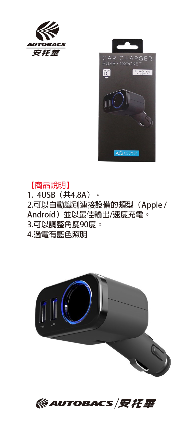 ●1孔+2USB(1USB輸出2.4A ,合計4.8A)。