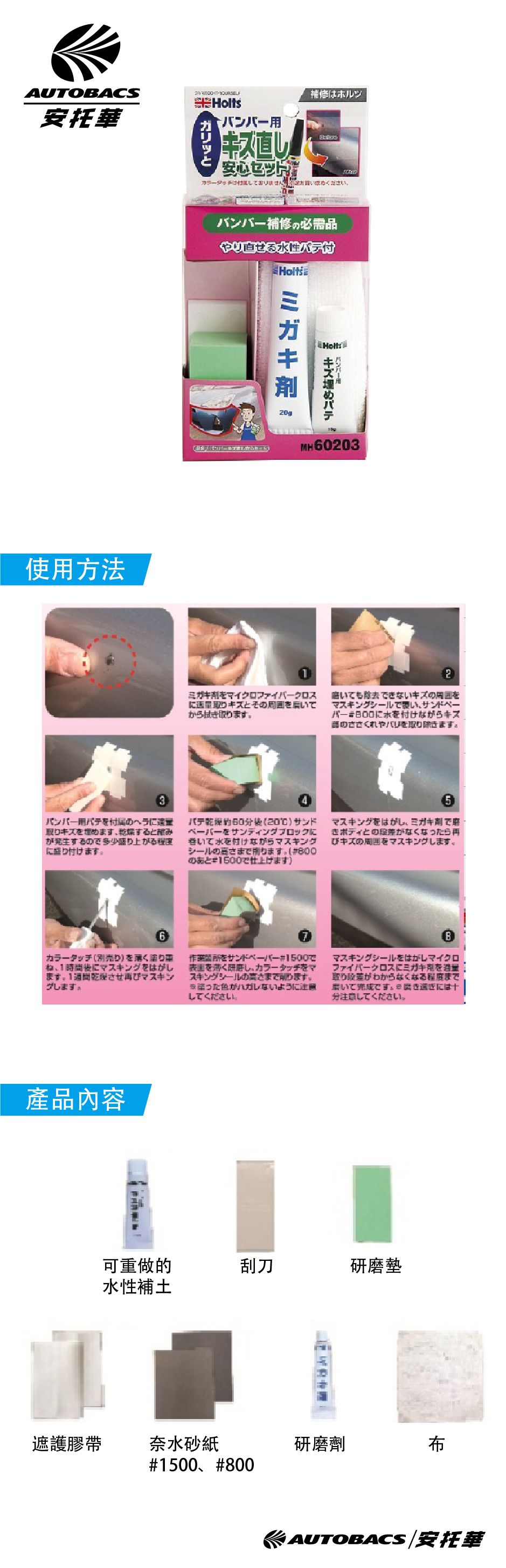 商品內含:可重做的水性補土、刮刀、布、研磨劑、研磨墊、遮護膠帶、耐水砂紙#1500×1、#800×1