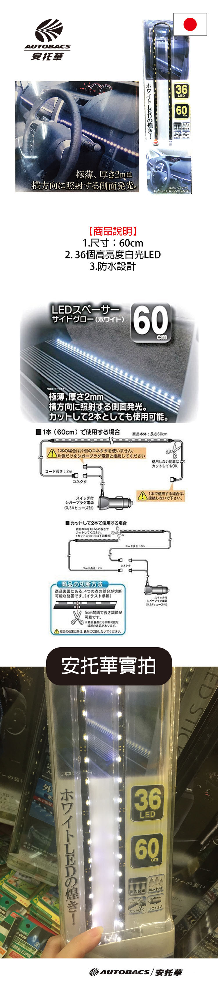 【商品說明】 1.尺寸:60cm 2. 36個高亮度白光LED 3.防水設計
