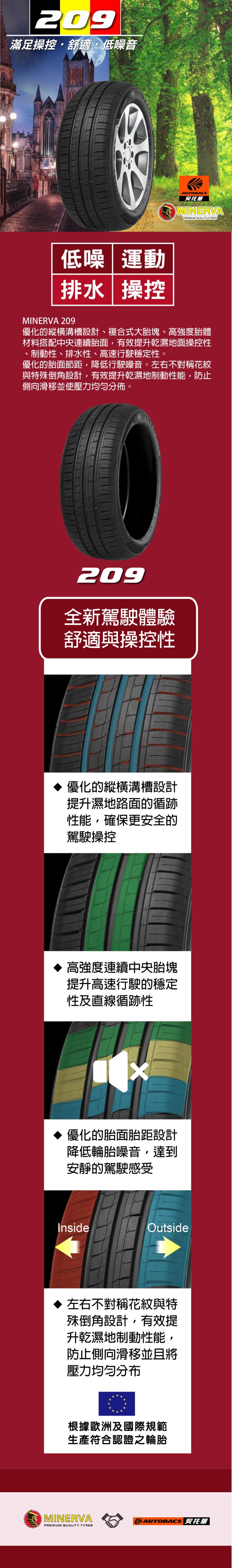 優化的縱橫溝槽設計、複合式大胎塊、高強度胎體材料搭配中央連續胎面,有效提升乾濕地面操控性、制動性、排水性、高速行駛穩定性。優化的胎面節距,降低行駛噪音。左右不對稱花紋與特殊倒角設計,有效提升乾濕地制動性能,防止側向滑移並使壓力均勻分佈。