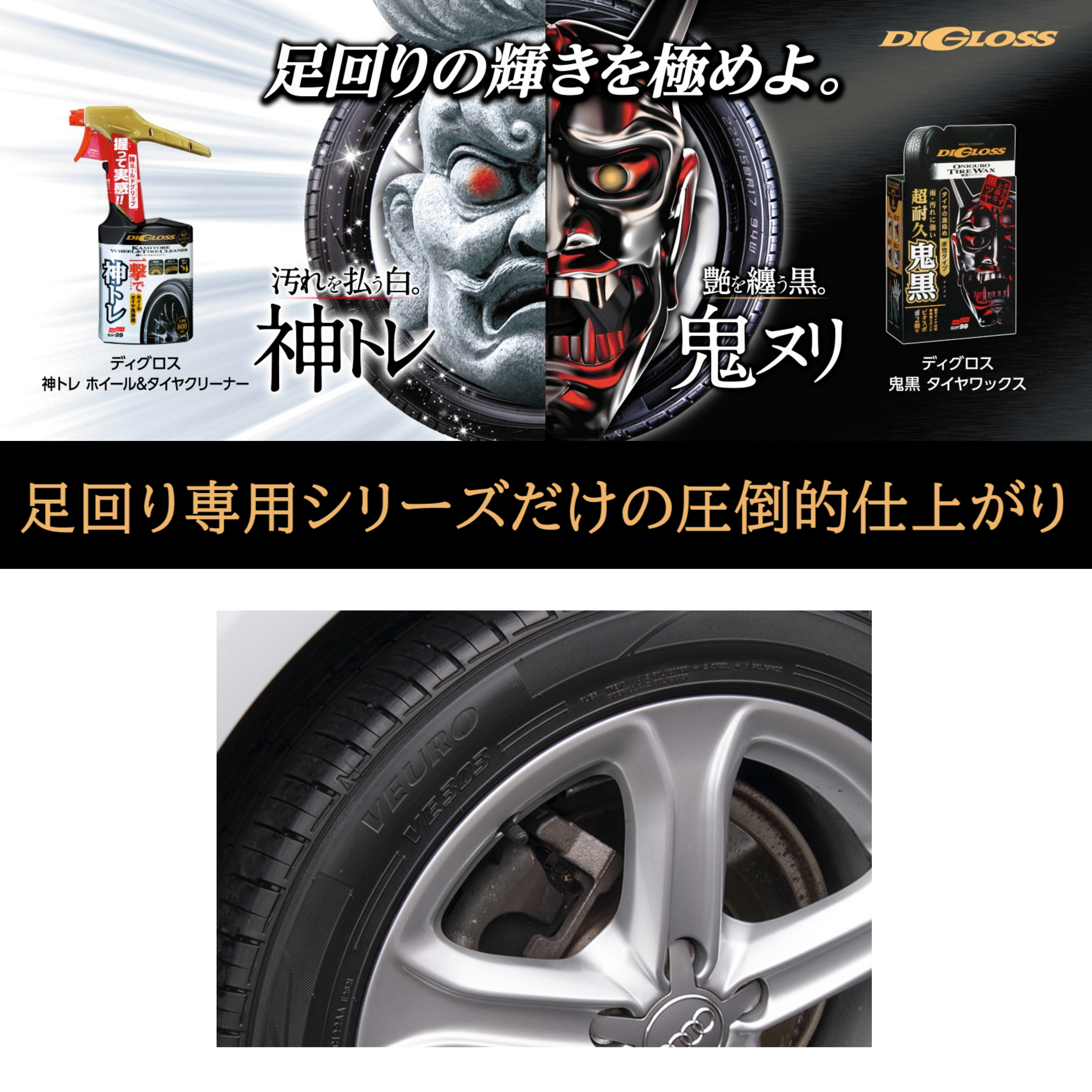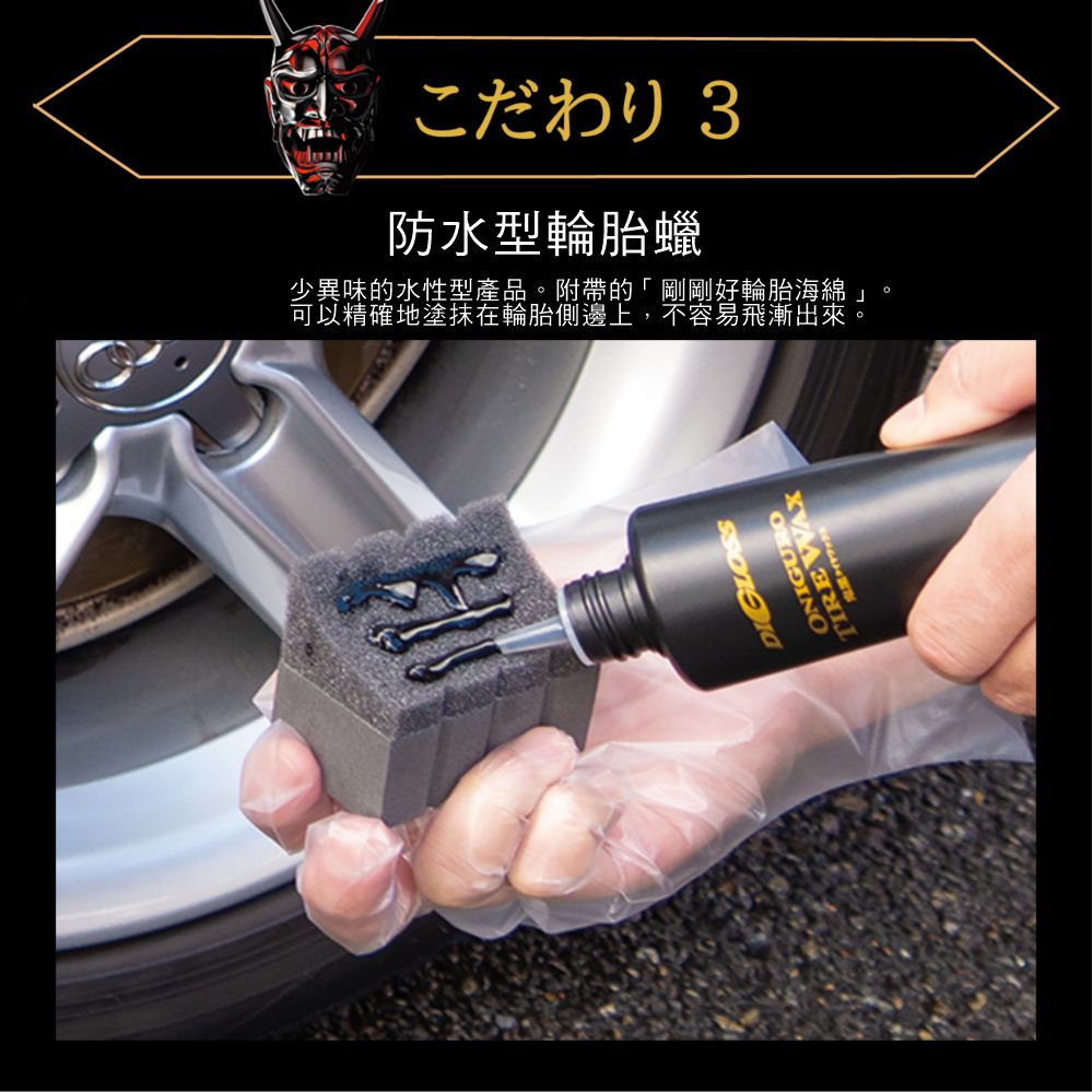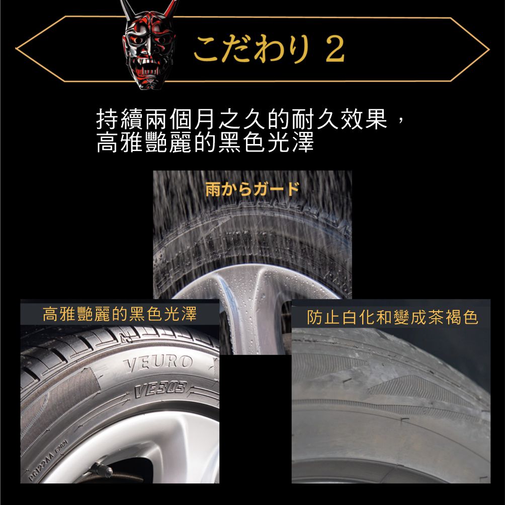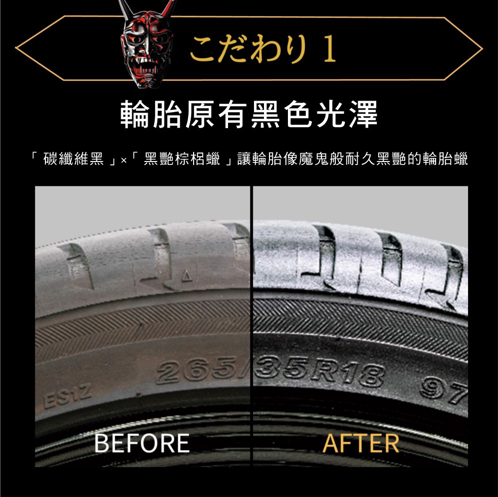 「碳纖維黑」×「黑艷棕梠蠟」讓輪胎像魔鬼般耐久黑艷的輪胎蠟。