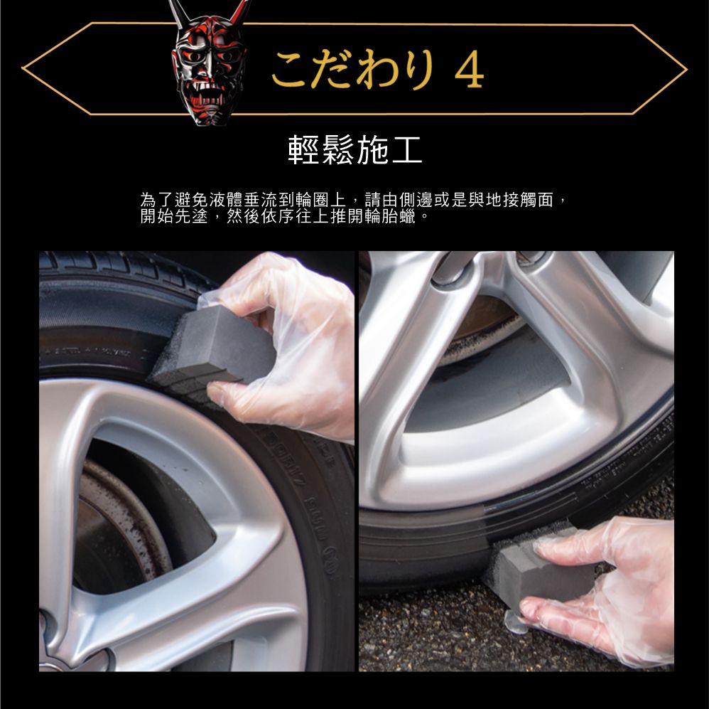 ※乾燥後。請用乾布應輕輕擦拭輪胎面以增加光澤度。若擦得太過用力,有可能會有效果不如預期的狀況。